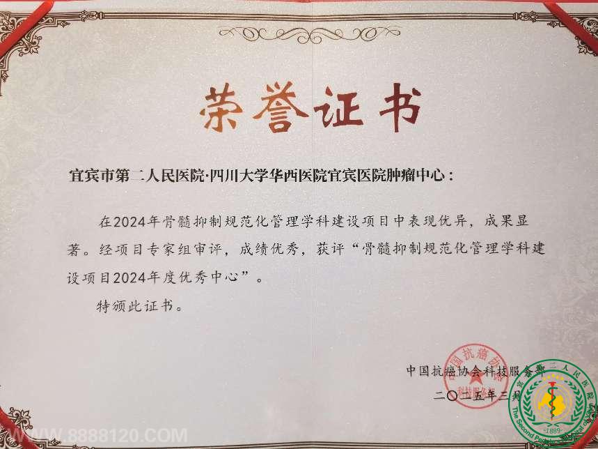 宜宾市第二人民医院·四川大学华西医院宜宾医院肿瘤中心获评“骨髓抑制规范化管理学科建设项目2024年度优秀中心”,中心主任雷开键受邀参加会议并领取优秀中心证书。