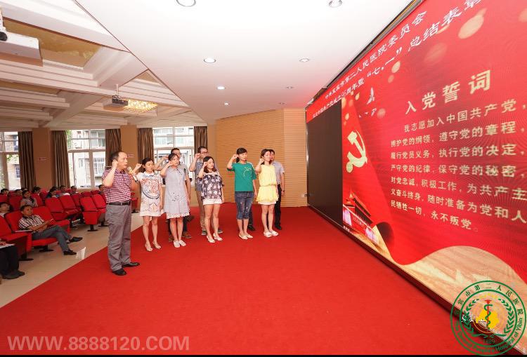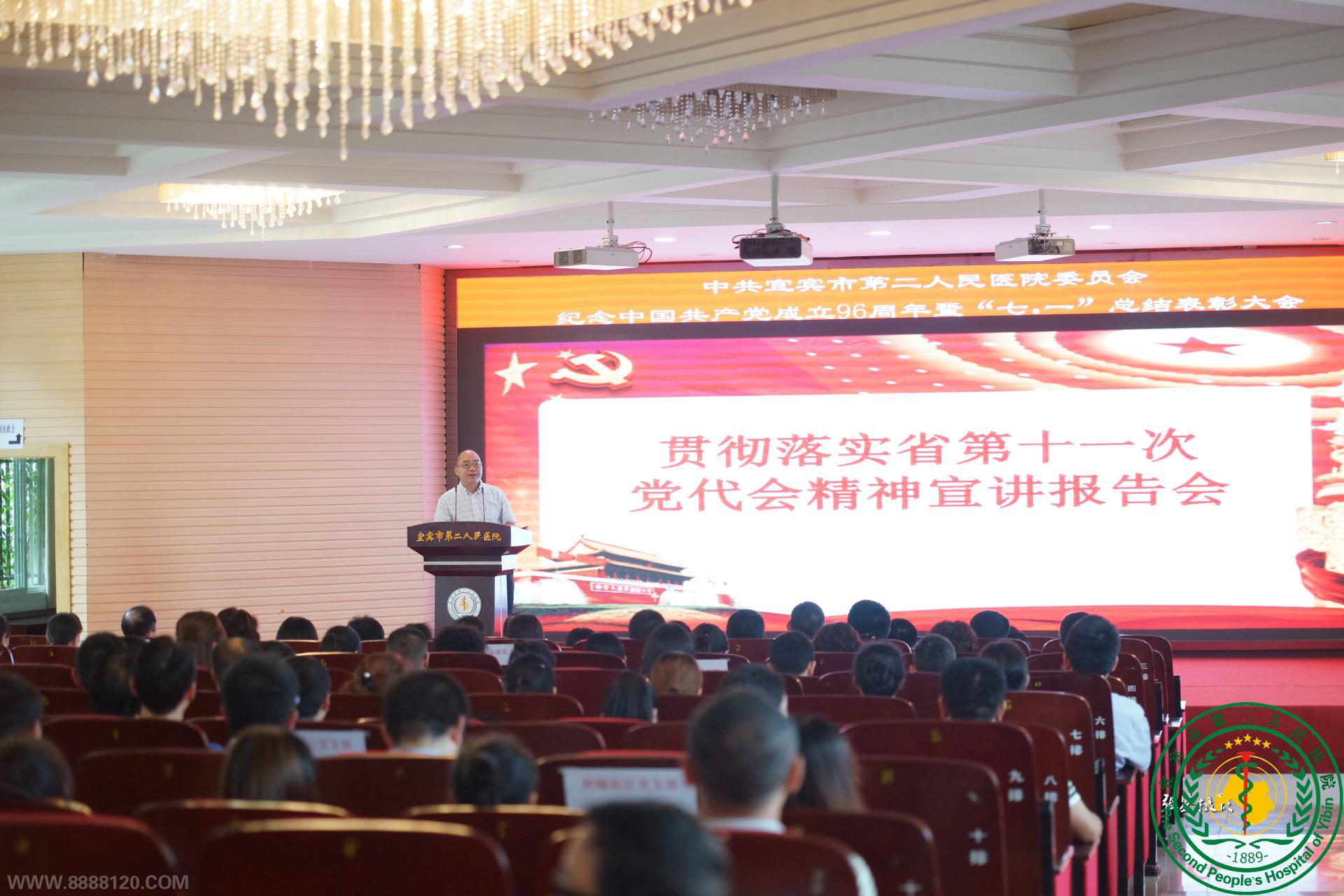 ——中共宜宾市第二人民医院委员会纪念中国共产党成立96周年暨学习贯彻省第十一次党代会精神宣讲大会 6月30日,院党委在我院仁德会堂举行纪念中国共产党成立96周年暨学习贯彻省第十一次党代会精神宣讲大会。我院党政领导班子成员出席了会议,医院各党支部、党员代表、新发展的共产党员参加会议。大会由院党委委员、副院长蔡苗主持。 会议在全体党员庄严嘹亮的《没有共产党就没有新中国》的歌声中拉开序幕。会上,院党委副书记、院长孙广运首先传达市委贯彻落实省第十一次党代会精神宣讲报告会,从“过去五年成就辉煌,成绩来之不易”、“未来五年蓝图宏伟,目标催人奋进”、“坚持以省党代会精神为指引,在新起点上推动宜宾新一轮大发展”三个方面作了重点宣讲,既深刻阐述了省第十一次党代会精神实质和内涵,又对方法路线提出了目标和要求。 紧接着,孙院长就纪念中国共产党成立96周年大会作重要讲话,对本年度的党委工作做了总结,并对来年的工作重点和奋斗目标做了相关安排和部署。 会议的主要目的是为纪念中国共产党建党96周年,充分展示党的十八大以来我院党员干部在医院发展中勇挑重担,为我院医疗卫生事业发展谱写新篇章的鲜明导向,激励各党支部和广大党员认真开展推进“两学一做”学习教育习常态化制度化,进一步动员广大党员干部解放思想,与时俱进,团结拼搏,扎实工作,为全面完成医院今年各项工作而努力奋斗。大会共表彰了8个先进基层党组织、22名优秀党务工作者和78名优秀共产党员,新发展了9名预备党员,10名预备党员按期转正。 此次大会,不仅表彰了先进、鼓舞士气同时也向党组织输送了新鲜的血液,为加快医院明天更快更好发展奠定了扎实的基础。