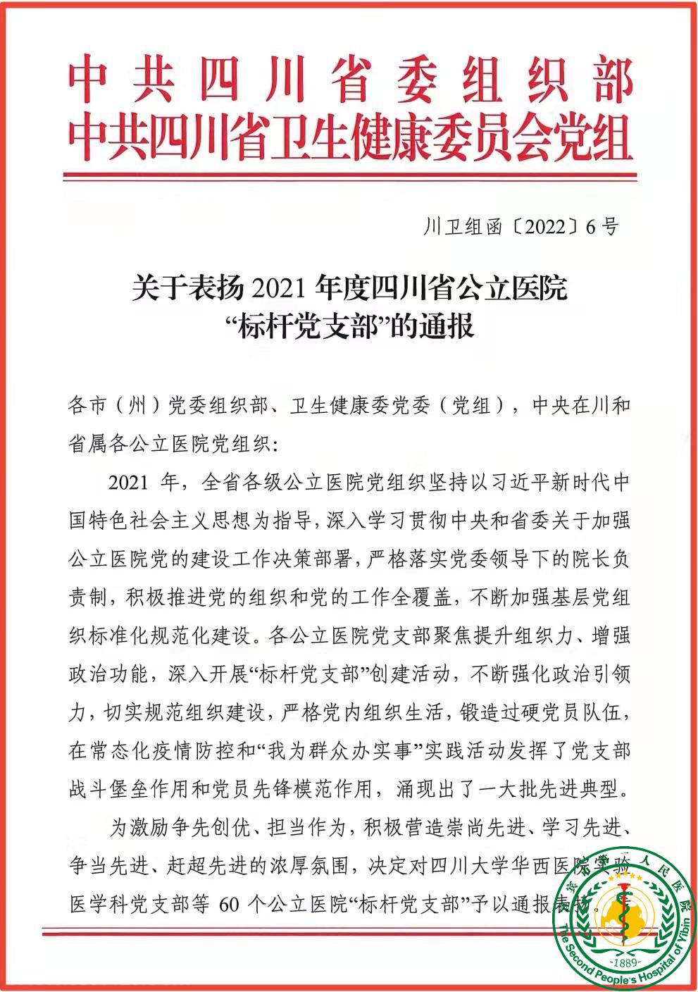 喜报——宜宾市第二人民医院感染党支部被评为2021年度四川省公立医院“标杆党支部”42270