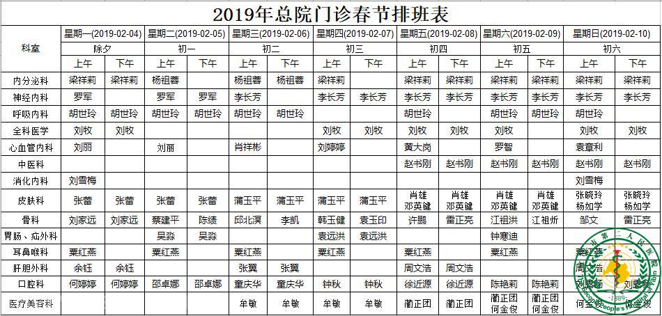 2019年2月总院门诊春节排班表