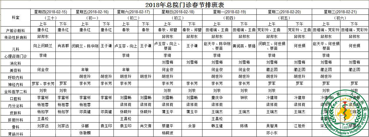 2018年2月春节总院排班表
