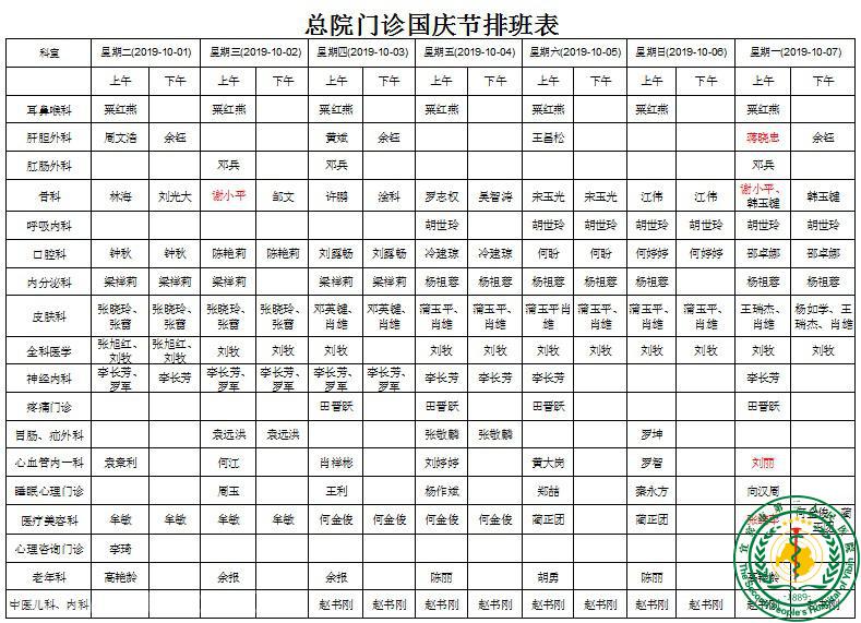 2019年国庆节总院门诊排班表