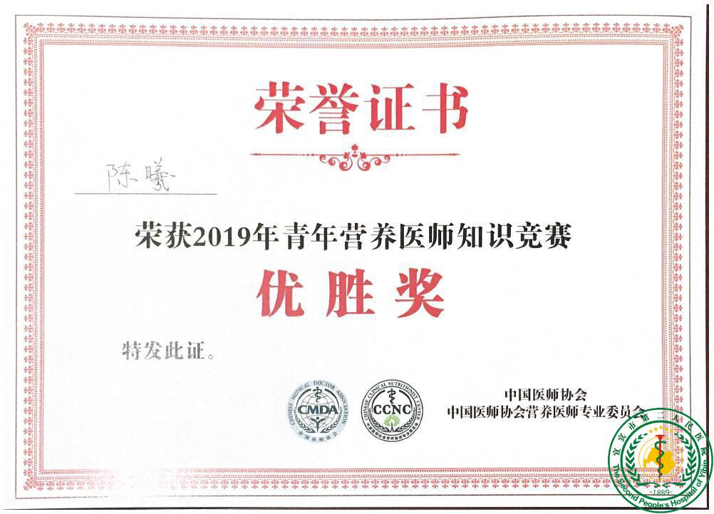 祝贺我院临床营养科荣获2019年中国医师协会营养医师专委会“医疗膳食工作优秀科室”奖