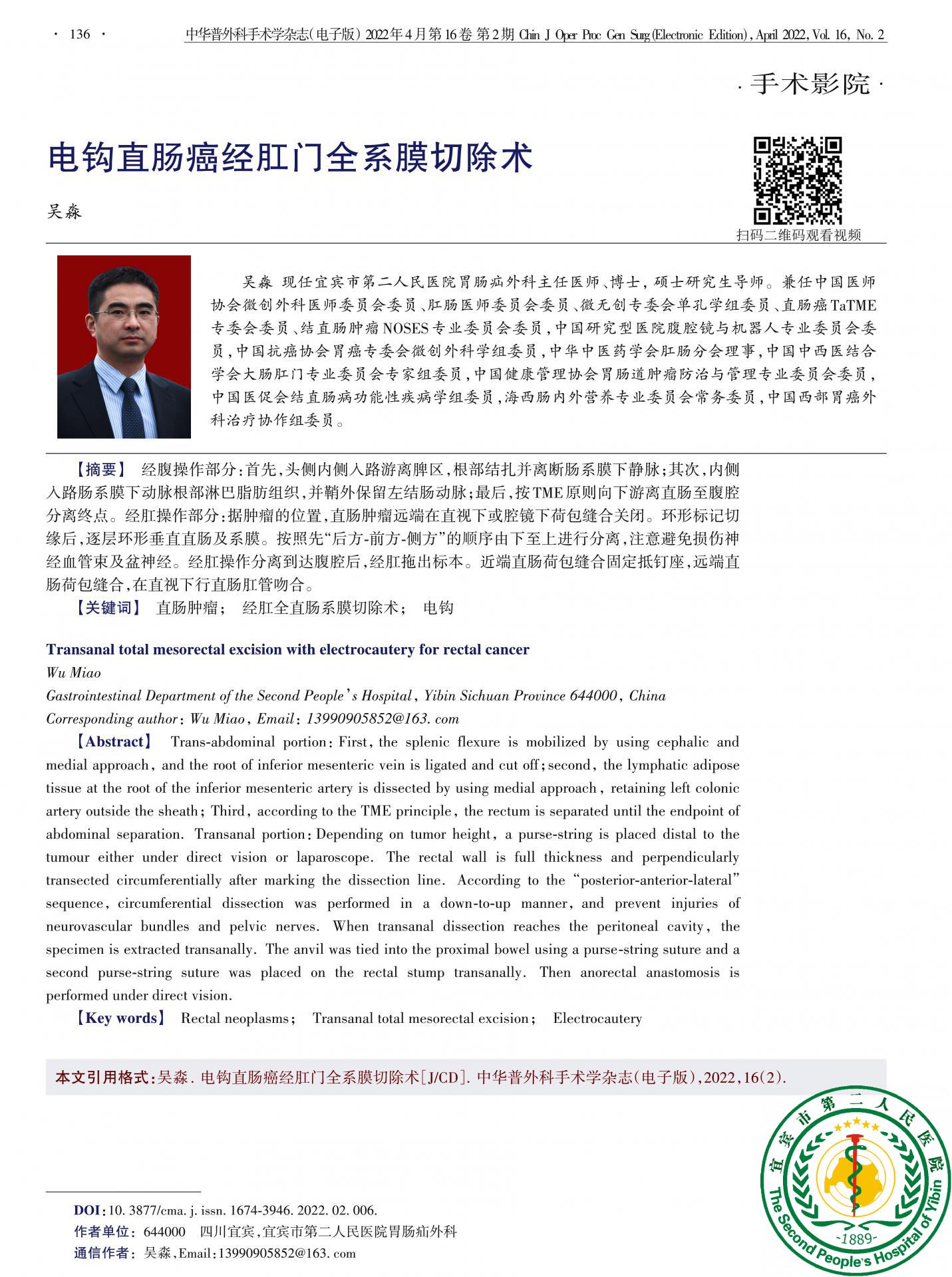 我科《腹腔镜直肠癌超低位保肛手术视频》在中华普外手术学杂志(电子版)发表