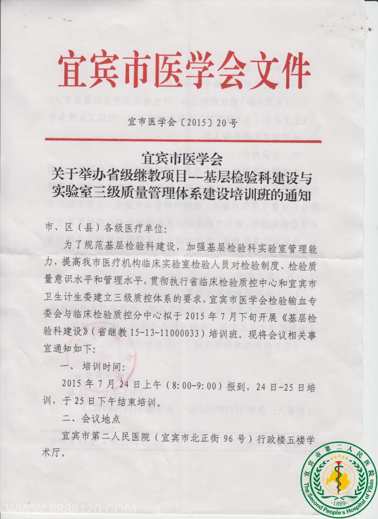 宜宾市医学会关于举办省级继教项目——基层检验科建设与实验室三级质量管理体系建设培训班通知9878