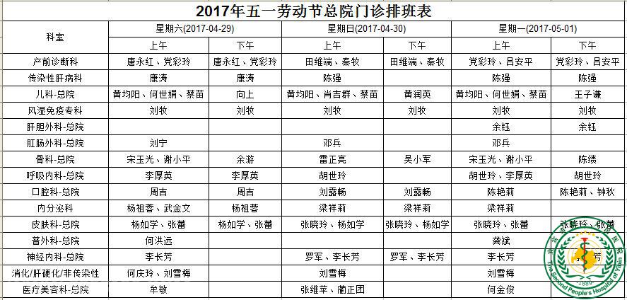 2017年五一总院门诊排班表